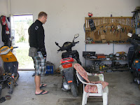 Místní skútrservis, kde jsme se také zastavili na kus řeči. Pan majitel a mechanik v jedné osobě byl sympaťák, dokonce si sám vyrobil motorku na fotografii. Základ je Yamaha 600, ale plasty jsou vlastní výroby a provedení bylo opravdu moc pěkné.