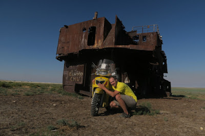 Plni očekávání příjíždíme asi po posledních 3 hodinách jízdy do Aralsku, je kolem poledne a my vyrážíme do města zjistit, jak to vypadá a poptat se místních kde jsou lodě. To netrvá tak dlouho, protože lidé jsou tu ochotní, tak nás zavedou k býválému přístavu, kde je nyní sportoviště a je tam jedna loď na památku toho co tu kdysi bývalo.