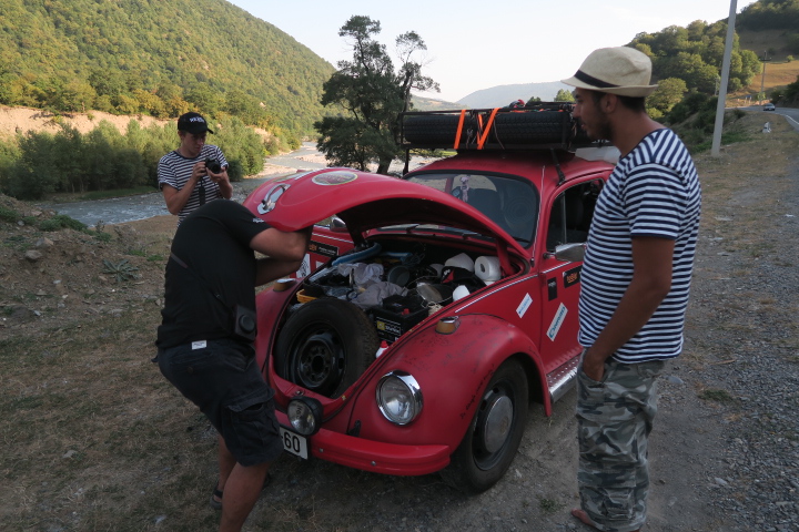 Dále jsme pokračovali na sever v Ruským hranicím a cestou potkali dva kluky z Česka, kteří cestují VW Broukem za Kavkaz. Pohovořili jsme o našich projektech, Radek specialista na škrkpásky a lepidla jim opravil odstávající lištu a frčíme dál. Cesta je překrásná, přes Kavkaz. Přespání jsme našli v poslední vesnici před hranicemi.
